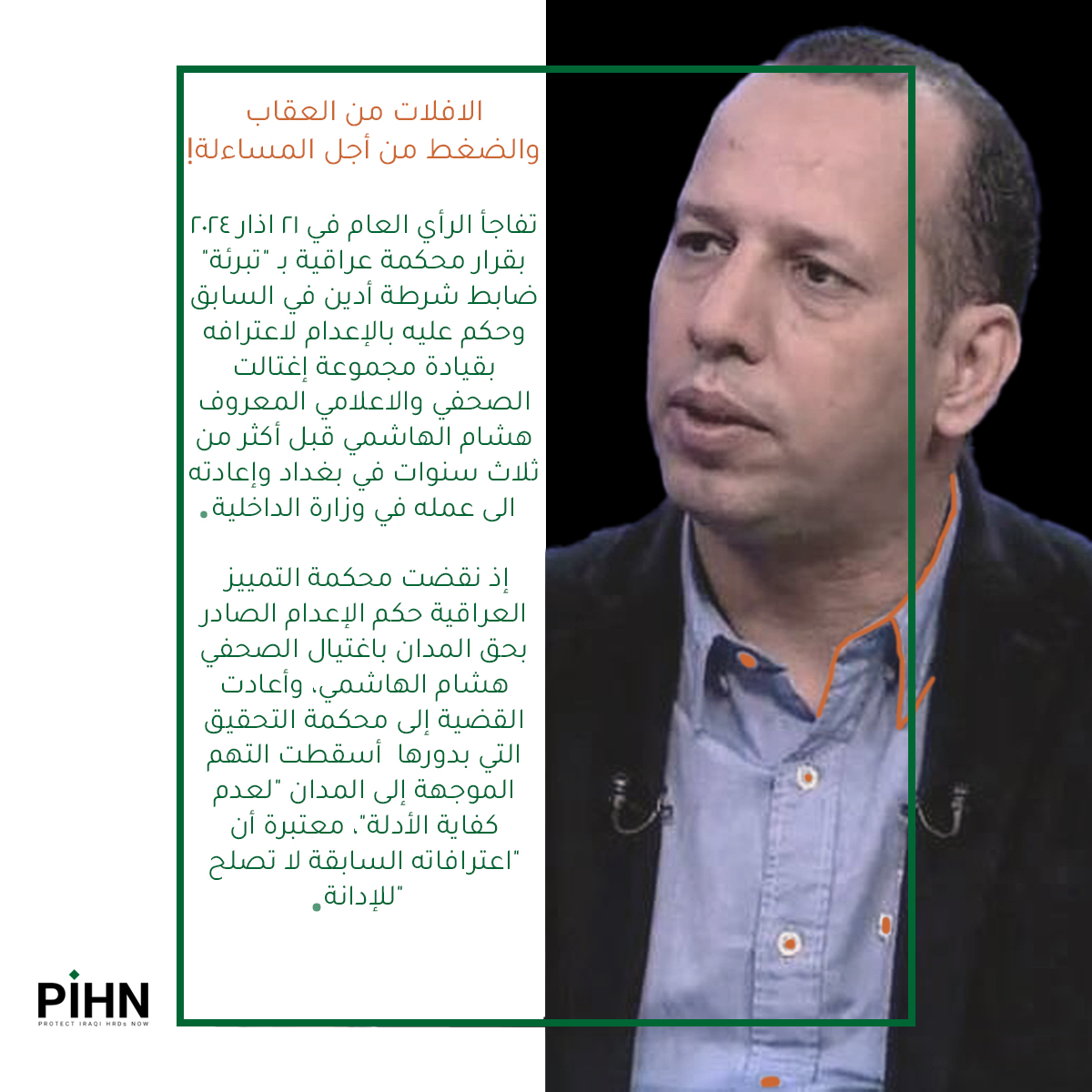 تفاجأ الرأي العام في 21 اذار 2024 بقرار محكمة عراقية بـ "تبرئة" ضابط شرطة أدين في السابق وحكم عليه بالإعدام لاعترافه بقيادة مجموعة إغتالت الصحفي والاعلامي المعروف هشام الهاشمي قبل أكثر من ثلاث سنوات في بغداد وإعادته الى عمله في وزارة الداخلية، إذ نقضت محكمة التمييز العراقية حكم الإعدام الصادر بحق المدان باغتيال الصحفي هشام الهاشمي، وأعادت القضية إلى محكمة التحقيق التي بدورها  أسقطت التهم الموجهة إلى المدان "لعدم كفاية الأدلة"، معتبرة أن "اعترافاته السابقة لا تصلح للإدانة".