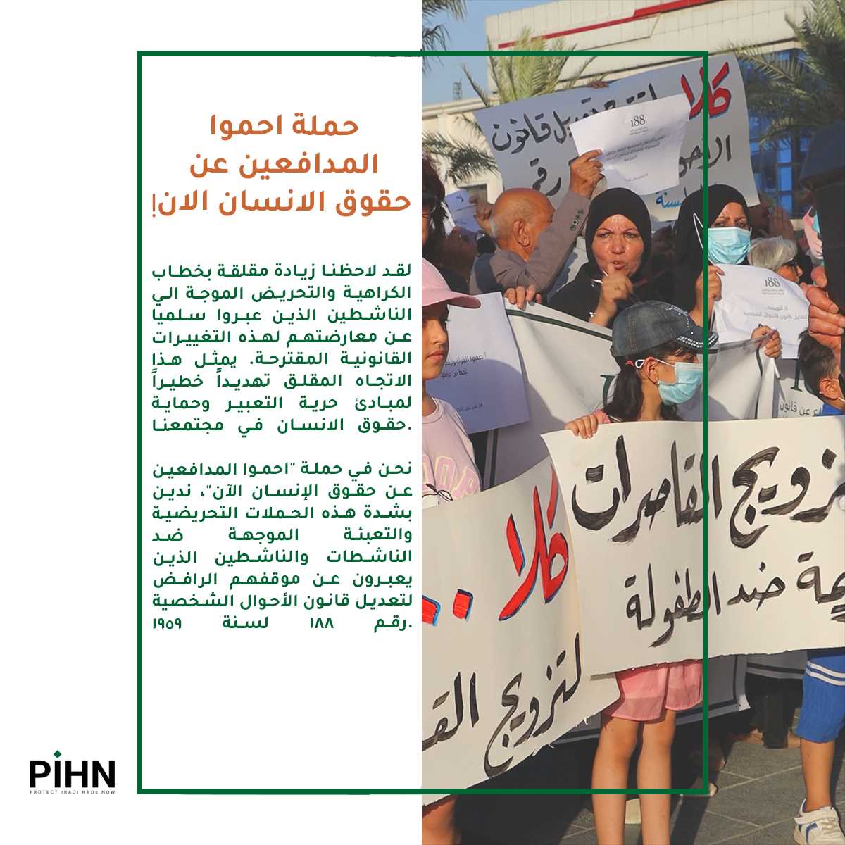 نحن في حملة "احموا المدافعين عن حقوق الإنسان الآن"، ندين بشدة هذه الحملات التحريضية والتعبئة الموجهة ضد الناشطات والناشطين الذين يعبرون عن موقفهم الرافض لتعديل قانون الأحوال الشخصية رقم 188 لسنة 1959.